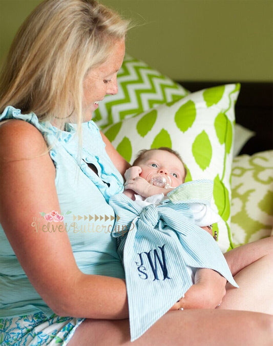 Baby Swaddle - Monogrammed Seersucker Swaddle - Bow - Newborn Photoshoot - Newborn Photos, Maternity Photo Prop, Newborn Photo Prop