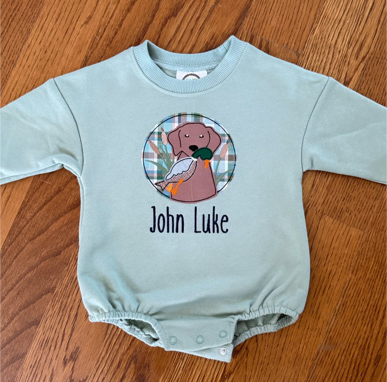 Perfect for Fall! The bubble sweatshirt with a Hunting Dog with Mallard - your choice of personalized monogram!
